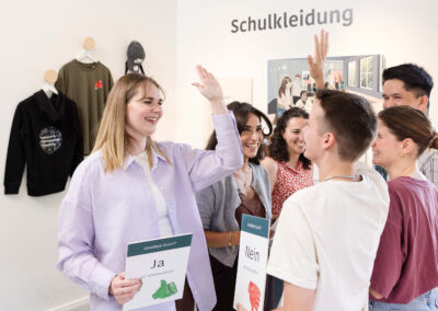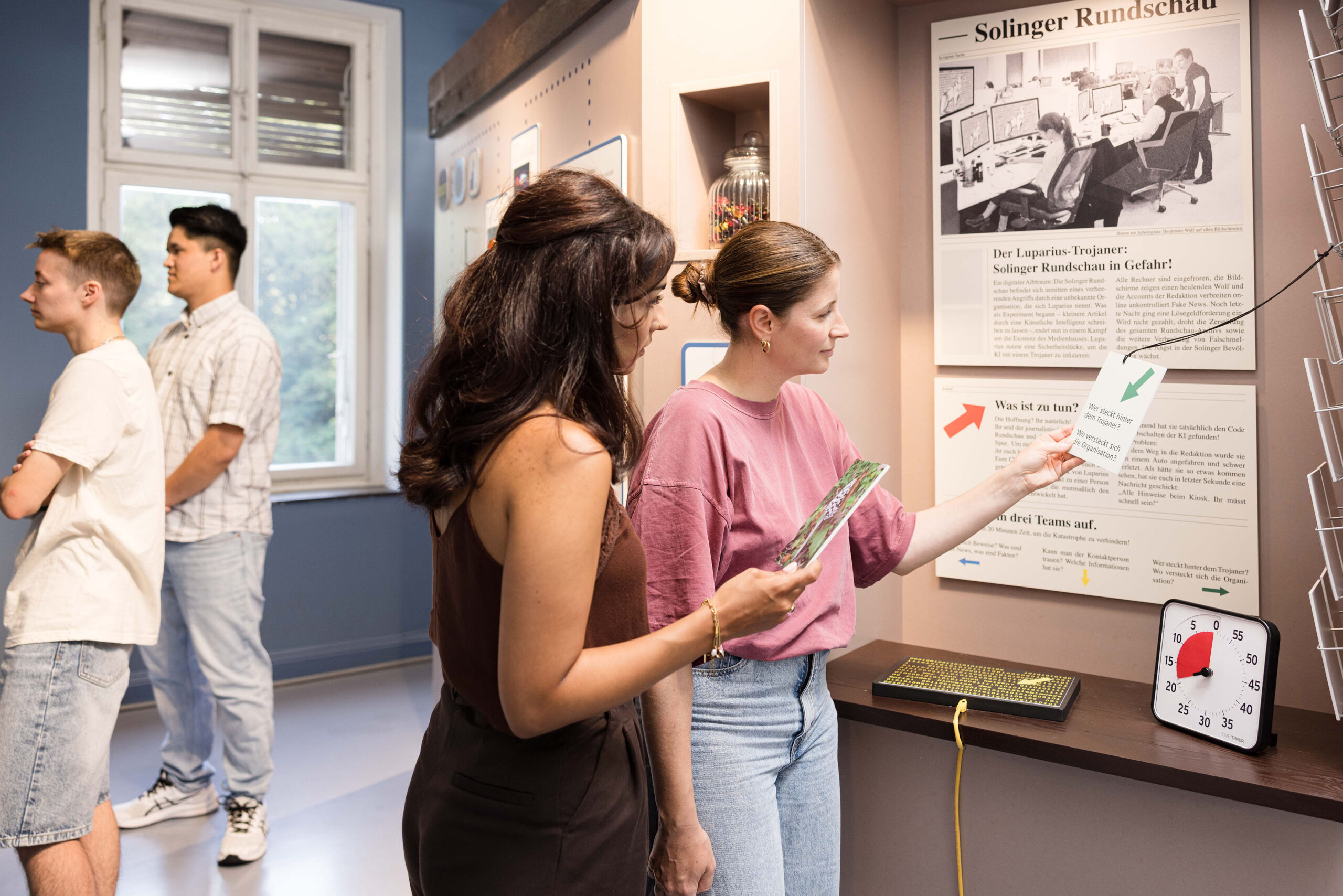 Die Ausstellung bietet in vier Räumen der Fabrikantenvilla spielerische Erfahrungen rund um das Thema Demokratie und ist vor allem ausgerichtet auf Jugendliche, die als Schulklasse die Räume besuchen. In Gruppen aufgeteilt kann in jedem Raum ein unterschiedliches Spielformat aktiv ausprobiert werden: Es wird debattiert um Kompromisse zu finden, ein Escape-Game-Rätsel gelöst um mehr über Meinungs- und Pressefreiheit zu erfahren, ein digitales Spiel regt zum Nachdenken über Freiheit an und in einem Brettspiel wird Teilhabe in der Stadt Solingen nachgespielt.